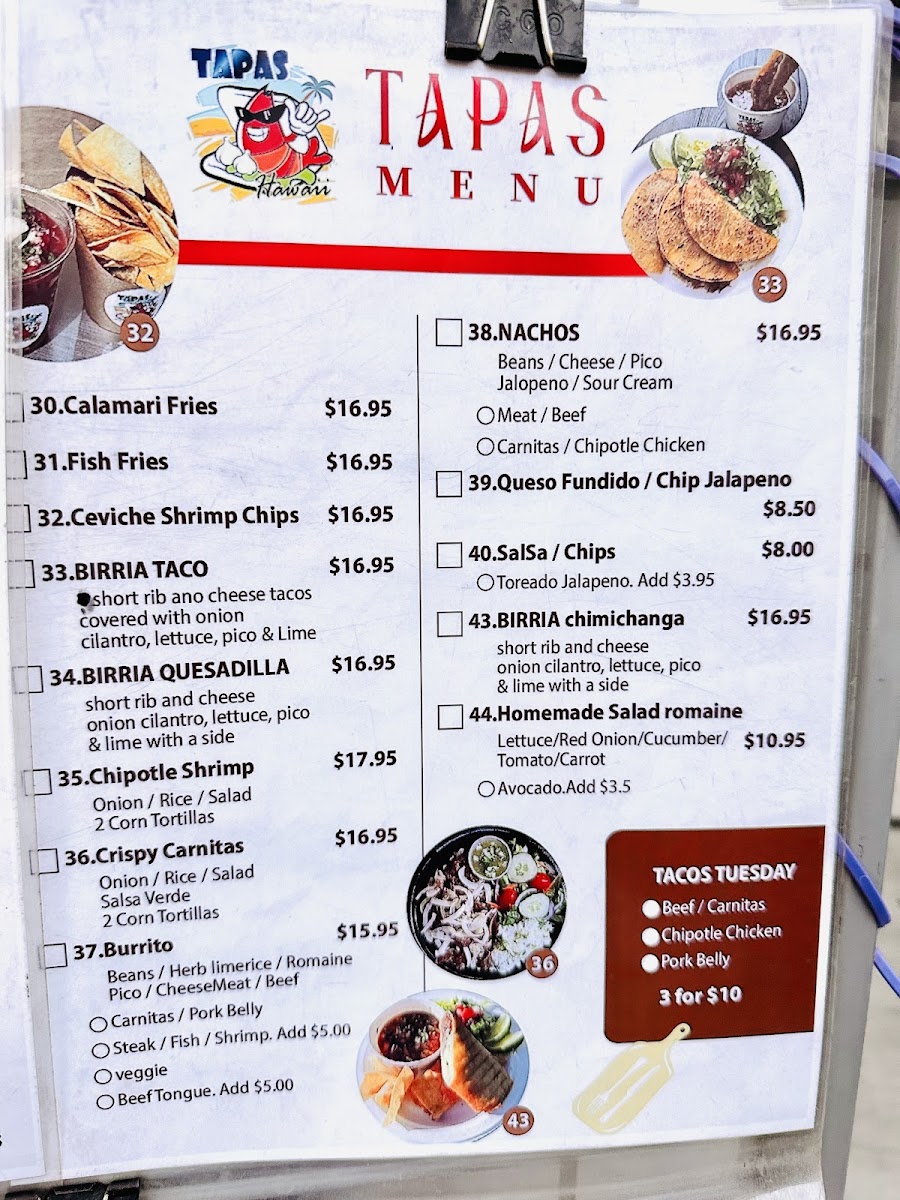 With a charm that embodies the spirit of the islands, Tapas Kitchen offers an array of mouthwatering dishes that showcase the essence of comfort food with a twist. From the savory Nachos to the rich and flavorful Birria Quesadilla, there's something to satisfy every palate.